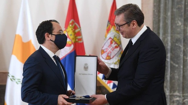 Predsednik Srbije Aleksandar Vučić uručio je ministru inostranih poslova Kipra Nikosu Hristodulidisu Orden srpske zastave prvog stepena.